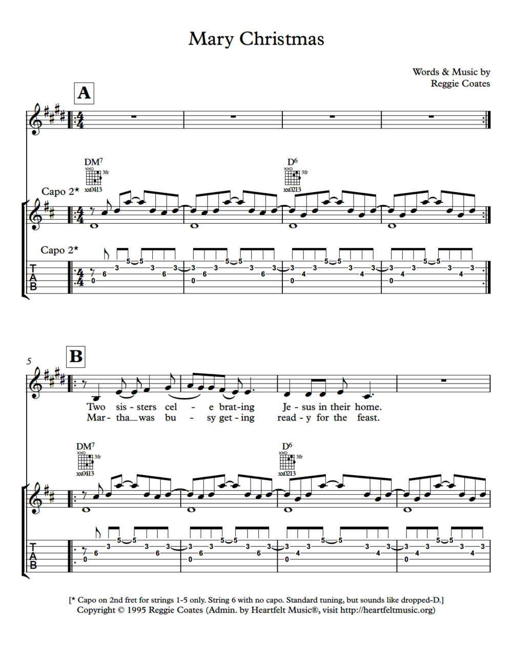 This is a manuscript of Reggie's song Mary Christmas fully transcribed in music notation and guitar tab. You can see exactly how he plays and sings it. This song reflects on Mary and Martha's dinner with Jesus in Luke 10:38-42. Mary sat at Jesus feet listening to Him while Martha was worried about the dinner plans. Jesus said Mary has chosen the better way, so I wish you a Mary Christmas, not a Martha Christmas.